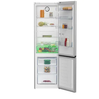 Высокий двухкамерный холодильник Beko серебристого цвета с нижней морозильной камерой и общим объемом 403 л. В холодильной камере расположен ящик для фруктов и овощей с технологией 3-х цветов HarvestFresh, благодаря которой продукты дольше остаются свежими и сохраняют натуральный вкус и витамины. Двухконтурная система охлаждения NoFrost Dual Cooling (Ноу Фрост) обеспечивает раздельное охлаждение холодильной и морозильной камер и предотвращает образование льда на стенках, поэтому холодильник не нужно размораживать, а запахи между камерами не смешиваются.