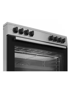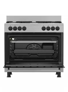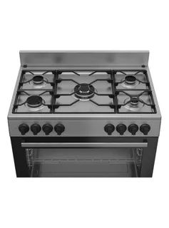 Комбинированная плита шириной 90 см выполнена под цвет нержавеющей стали и сочетает газовую варочную поверхность и электрический духовой шкаф. Благодаря своей нестандартной ширине имеет сразу 5 газовых конфорок, оснащенных автоматическим электроподжигом и системой газ-контроля, которая автоматически прекращает подачу газа, если пламя случайно потухнет, также есть Wok конфорка. Электрический духовой шкаф плиты предлагает 8 основных режимов работы, включая размораживание и 3D-приготовление. В комплектацию плиты входят 2 стандартных противня, решетка для духовки, чугунные решетки для варочной поверхности и подставка для турки.